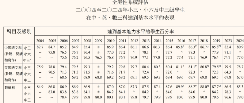 育局发言人今日(11月4日)表示,已收到考评局提交的2024年全港性系统评估报告。相比去年,今年参与评估的小三和中三学生在中、英、数三个主要科目的表现大致平稳。