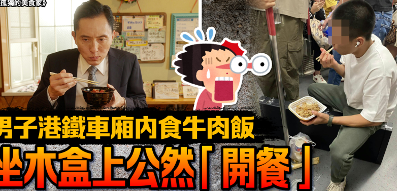 港铁条例规定,车厢内不得饮食,违者将被罚款2,000元。昨日(11月4日),网络上流传1张相片,显示有一名男子坐在一个疑似装乐器的木盒上,公然进食牛肉饭,沉浸在自己世界里“开餐”,完全无视车厢内其他乘客。有同车乘客觉得不满,随即拍照公审到网上,引来网民批评其行为无公德。