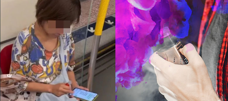 有网民以“点解而(依)家啲人可以夸张到,喺地铁入面食电子烟”为题发布短片。画面可见一名中年妇女在港铁关爱座上,一手拿着手机,另一手则持着电子烟,期间怀疑在车厢内吸食电子烟,吞云吐雾,旁若无人,并拿起手机用录音说话。她看起来似乎没有精神,因此,有网民怀疑她正在进行吸毒行为。