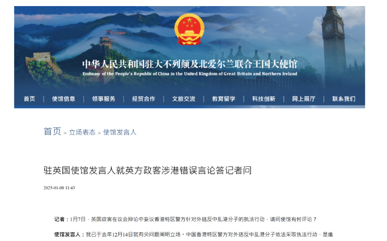 据中国驻英国使馆网站消息,中国驻英国使馆发言人就英方政客涉港错误言论答记者问。记者提问,1月7日,英国政客在议会辩论中妄议香港特区警方针对外逃反中乱港分子的执法行动,请问使馆有何评论?