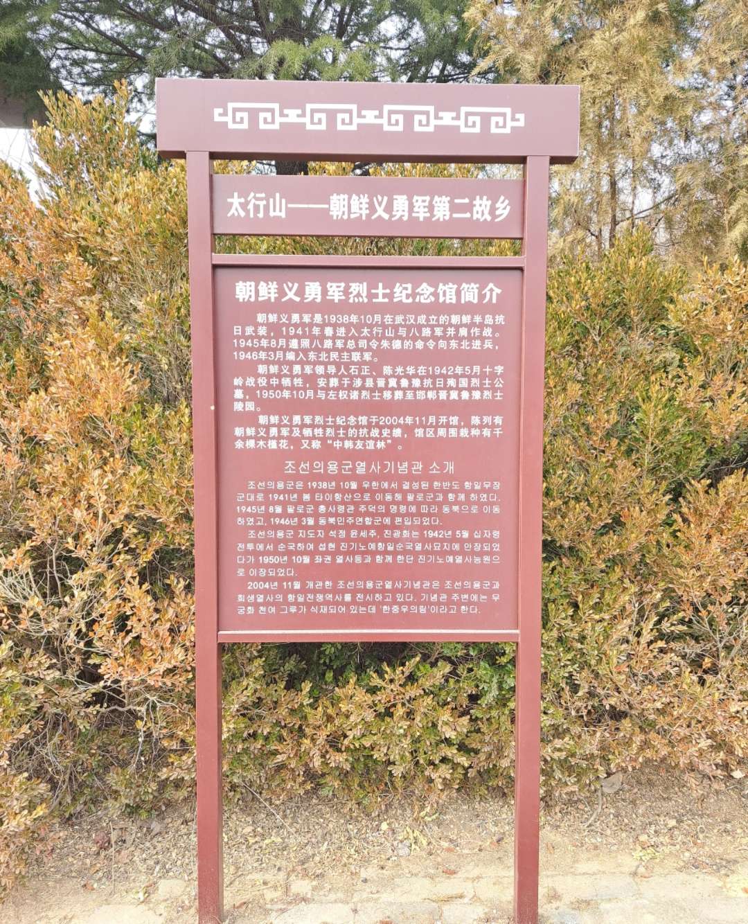 朝鲜义勇军烈士纪念馆建成于2004年,作为国内第一座纪念朝鲜义勇军的展馆,它全面展示了朝鲜义勇军在太行山区抗战的历史。馆内陈列着100余帧珍贵的历史照片和文献资料,以及石正烈士家乡韩国密阳市政府代表团从烈士故居带来的土壤、烈士生前发表的文稿等实物,生动再现了那段波澜壮阔的抗战岁月。