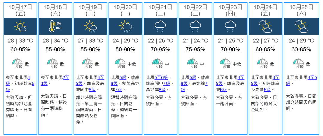 —— 这话确实在理,毕竟 10 月出现 “迟来酷热” 在香港并不罕见,2024 年 10 月 19 日就曾录得 33.7℃的年内最迟酷热纪录。