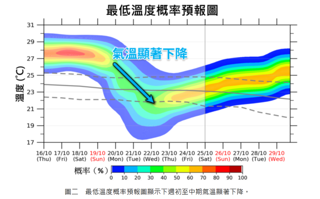 从香港天文台的预报图可见,目前仍在 28℃以上徘徊的气温,到下周初可能一夜跌至 21℃。