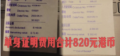 1.五月十一号前往金钟婚姻登记处现场办理单身证明,填表递交等待约一个小时即可办理完成,费用820元港币;