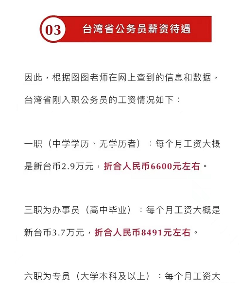 [二R]三职为办事员(高中毕业):每个月工资大概是新台币3.7万元,折合人民币8491元左右。