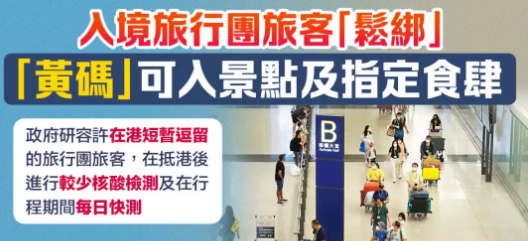政府指出,在平衡疫情风险和经济发展需要原则下,以及在考虑到由旅行代理商接待并由持牌导游陪同入境旅行团,可协助有关旅客在遵守防疫措施的情况下进行旅游活动,有关安排可协助入境旅游市场逐步有序恢复,为旅游业界提供更有利的营运空间。 同时探讨是否可在平衡疫情风险下,容许只在香港短暂逗留的入境旅行团旅客,在抵港后进行较少核酸检测,及在行程期间每天进行快速抗原测试。
