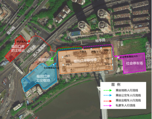福田口岸周边交通图地铁:地铁4号线在福田口岸联检楼无缝换乘; 地铁10号线换乘旅客出联检大楼1号门后,沿裕亨路往西过斑马线后到达地铁C号出口。