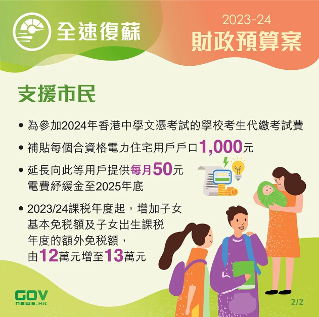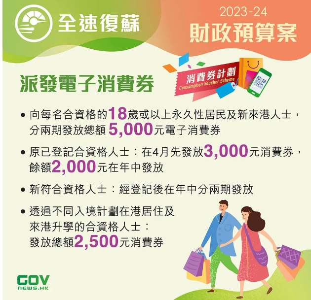 财政司司长陈茂波今日(22日)发表最新一份财政预算案。陈茂波公布,考虑当前经济、社会民生及政府财政状况后,今年会再向每名合资格的18岁或以上永久性居民及新来港人士,分两期发放总额5000元电子消费券,今年4月发放首期3000元消费券,年中发放第二期2000元消费券。