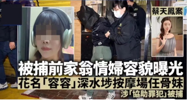 西九龙总区刑事部警司钟雅伦说,警方今日在尖沙咀拘捕一名47岁女子,涉嫌协助罪犯,相信为案中死者前家翁之情妇,相信他们在是在今个月租用相关单位犯案,并一度协助死者前夫藏匿。被捕中国籍女子姓伍,47岁,据知为案中死者前家翁的情妇。消息指,被捕情妇花名“容容”,于深水埗按摩场所任职“骨妹”,于数个月前与前家翁结识,她于2月中旬以月租4万多元租用西九龙柯士甸道西1号凯旋门的单位,用作窝藏蔡女的前夫,估计前夫早已知悉父亲有出轨行为。警方昨日到被捕情妇的工作场所寻人,惟她没有上班,向其同事查问后锁定其位置,于尖沙咀街头将她拘捕。