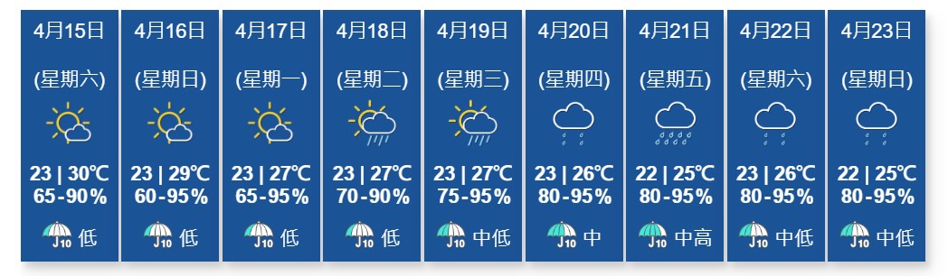 天文台表示,一道云带会在今日为华南带来骤雨。受较干燥的大陆气流影响,云带逐渐转薄,星期日该区大致晴朗。预料下周初偏南气流将为广东沿岸带来几阵骤雨。而一道低压槽会在下周中至后期为华南带来不稳定天气。