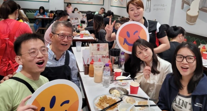 当天,陈茂波穿上围裙,戴上手套,亲身下厨煎豆腐,形容自己是实习生。他向顾客送上豆浆、烧卖、肠粉、萝卜糕等,并与市民合照。他又与访港旅客交流,希望对方享受在香港的旅程;有旅客形容自己近两日在香港“暴走式”游玩。