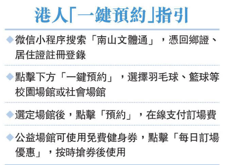 在蛇口生活的港青温先生喜欢打羽毛球,有一帮相熟许久的内地球友,工作之馀经常一起切磋球艺兼锻炼身体。他告诉香港文汇报记者,很早就听闻南山有免费的体育消费券可以抢,不过之前一直没开放给港人,所以都是看内地朋友抢券。“基本每天快到抢券时间,他们就会在群里发链接,谁抢到了谁就去订场。很高兴今年我也能有份参与了。”温先生说,单人券还能去游泳,可以丰富自己的业馀文化生活。