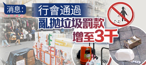 媒体报道,有消息指,行政会议今日(25日)通过调高乱抛垃圾罚款金额建议,由1500元增加至3000元,店舖阻街及非法弃置建筑废物则增至6000元。