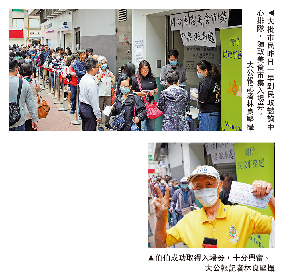 免费门票分为周六和周日两个入场时间,市民可选择其中一日,每人限领取两张。在观塘民政谘询中心,未到8时的派发时间,现场已有约70人排队。有市民先后排了三次队,共领取了六张入场券,计划到时与朋友一起前往,品尝不同美食,称希望政府多举办大型活动,带给市民欢乐。