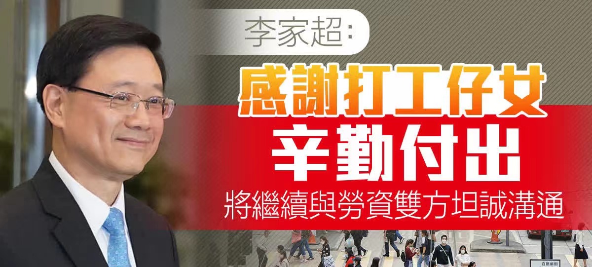 (5月1日)是五一国际劳动节,行政长官李家超在社交网站发文,向所有打工仔女致敬,感谢各位辛勤付出和努力工作,为国家和社会的繁荣发展作出重要贡献。