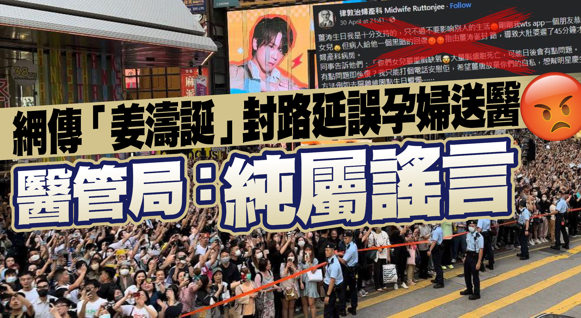 造谣者无所不用其极抹黑警方,近日网上谣称本周日(4月30日)男子组合MIRROR成员姜涛生日,大批歌迷于铜锣湾聚集为偶像庆祝期间,因警方实施临时封路措施,导致一名孕妇被延误送往律敦治医院诞女,婴儿更出现脑缺氧云云。