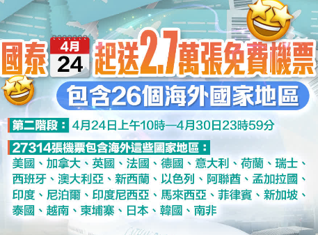 国泰航空推出“飞遇世界大赏”机票抽奖活动,送出27314张由香港飞往26个国家、46个城市的免费单人经济舱来回机票,抽奖结果今日(3日)公布。有份参与抽奖者,可先查阅电子邮箱(包含垃圾邮箱),如邮箱内并无收取中奖通知邮件,代表未能中奖。