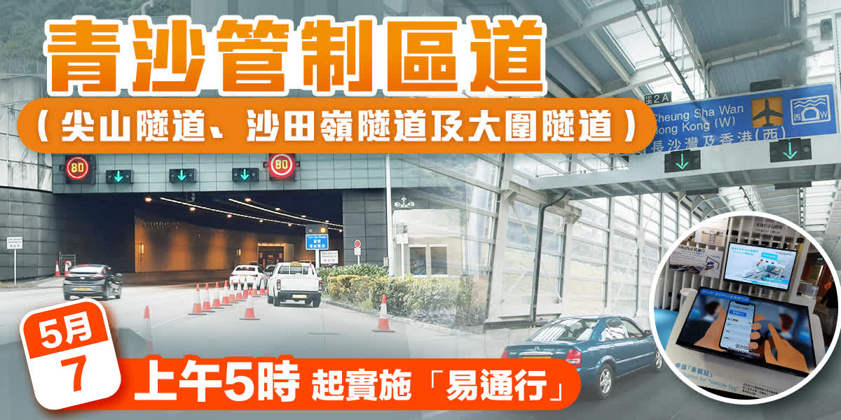 提醒市民,青沙管制区(尖山隧道、沙田岭隧道及大围隧道)将于本周日(5月7日)上午5时起实施“易通行”不停车缴费服务。届时驾驶者可直接驶过青沙管制区收费广场,无须于收费亭停车或排队付款。隧道费会透过缴费贴收取,所有人手收费亭及快易通车道将会取消。