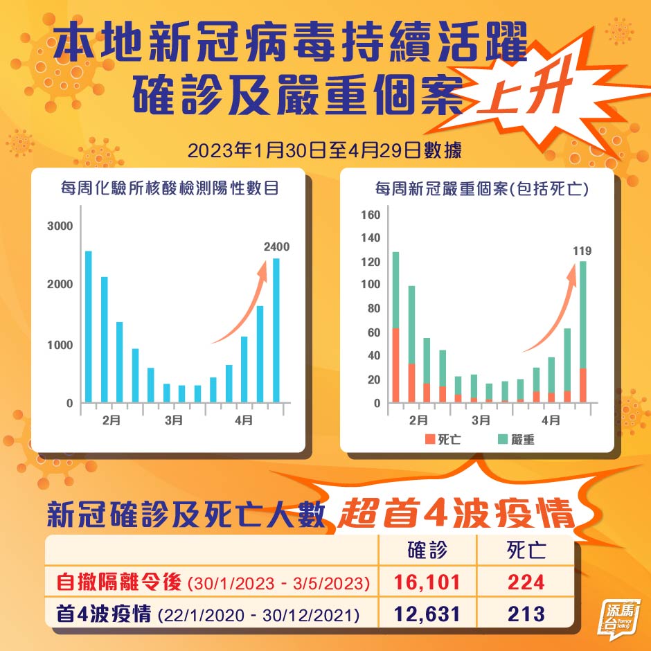 过去一周数据显示,化验所核酸检测阳性个案新增至2400宗(前一周为1615宗),严重及死亡个案亦上升至119宗(前一周为63宗)。由今年1月30日撤销隔离令起,累计化验所阳性核酸检测数目以及新冠死亡个案(截至5月3日),已超过首4波疫情总和。