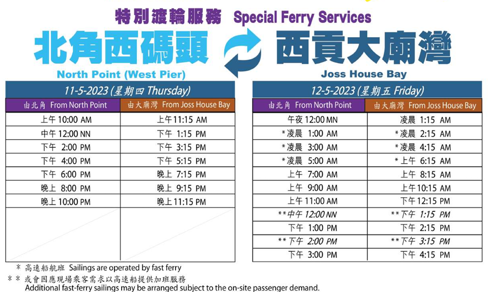 天后宝诞将至,新渡轮会于天后诞前夕及正日,即5月11日(星期四)及12日(星期五)安排特别渡轮服务,往来北角码头及西贡大庙湾。