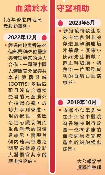 两地关係血浓于水,港人接受内地同胞捐赠造血干细胞非首次。在2019年10月,90后安徽籍青年毕昌林,为一位患病港人捐献了240毫升造血干细胞。