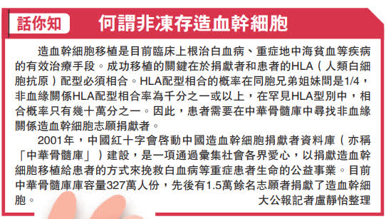 香港医学会会董、儿科医生陈以诚表示,要在本港寻找合适的干细胞移植并不容易,但香港背靠祖国,内地拥有14亿人口,若病人危急,从内地血库寻求合适干细胞移植,可为病人带来希望。