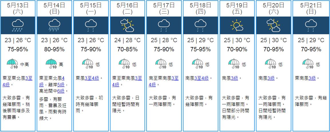 天文台预测,今日大致多云,有几阵骤雨,吹和缓东至东北风。展望明日稍后骤雨增多,星期日雨势有时颇大,有雷暴及狂风。随后一两日骤雨逐渐减少,天色较为明朗。
