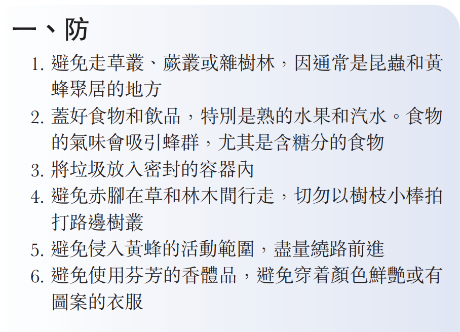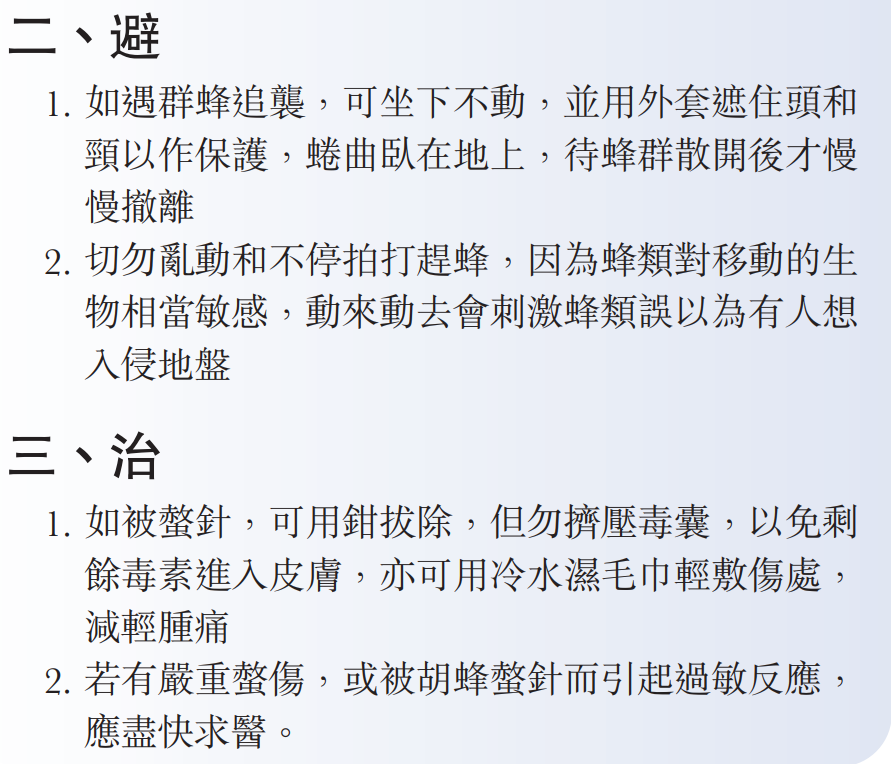 本港有各种蜂类,巿民在户外工作或郊游时要小心被叮螫。综合不同专家的意见,表示倘不幸遇到蜂群袭击,不要惊慌及逃跑,应蹲下保护头部,以免激发野蜂加强袭击,倘已被螫,应尽快用钳等工具拔出毒刺,以冰袋或者湿毛巾轻敷伤处以减轻肿痛,倘出现呼吸困难等严重症状,应立即报警召唤救护车送院。