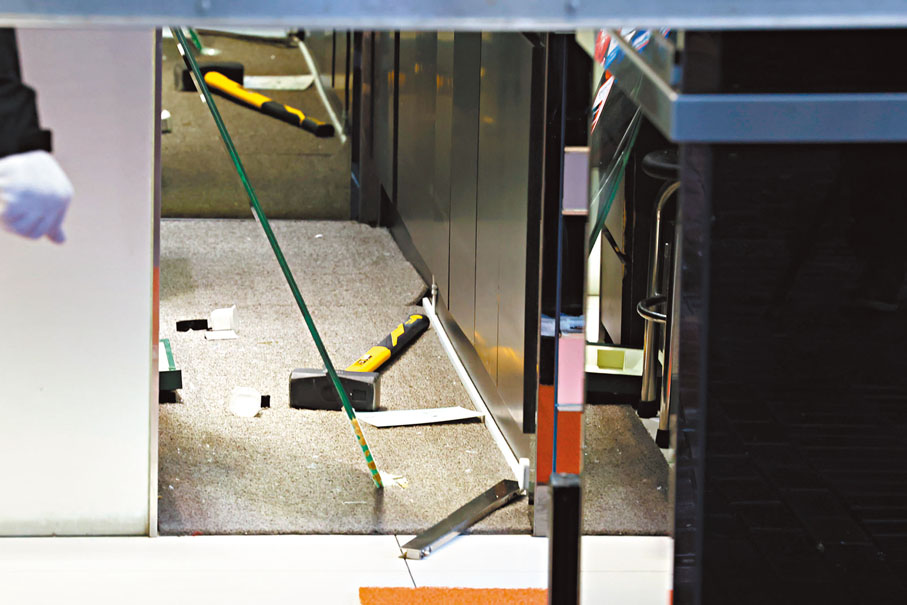 现场为屯门启发径1号至13号地下街铺“金宝成钟表珠宝”,上址主要售卖各大品牌名表外,亦有金器和珠宝。昨日上午约11时30分,店铺开门营业不久,突有3名身穿黑衫黑裤、戴口罩和鸭舌帽的男匪徒,分持利刀和铁鎚进入店铺指吓职员并高呼:“打劫!”当时在店内4名店员不敢妄动,歹徒随即挥舞铁鎚击毁3个玻璃饰柜,将大量名贵手表放入携来的红白蓝袋中。得手后即逃出店舖奔至约100米外的杯渡路桥底,登上一辆接应的银色私家车沿屯门公路往元朗方向逃去无踪。