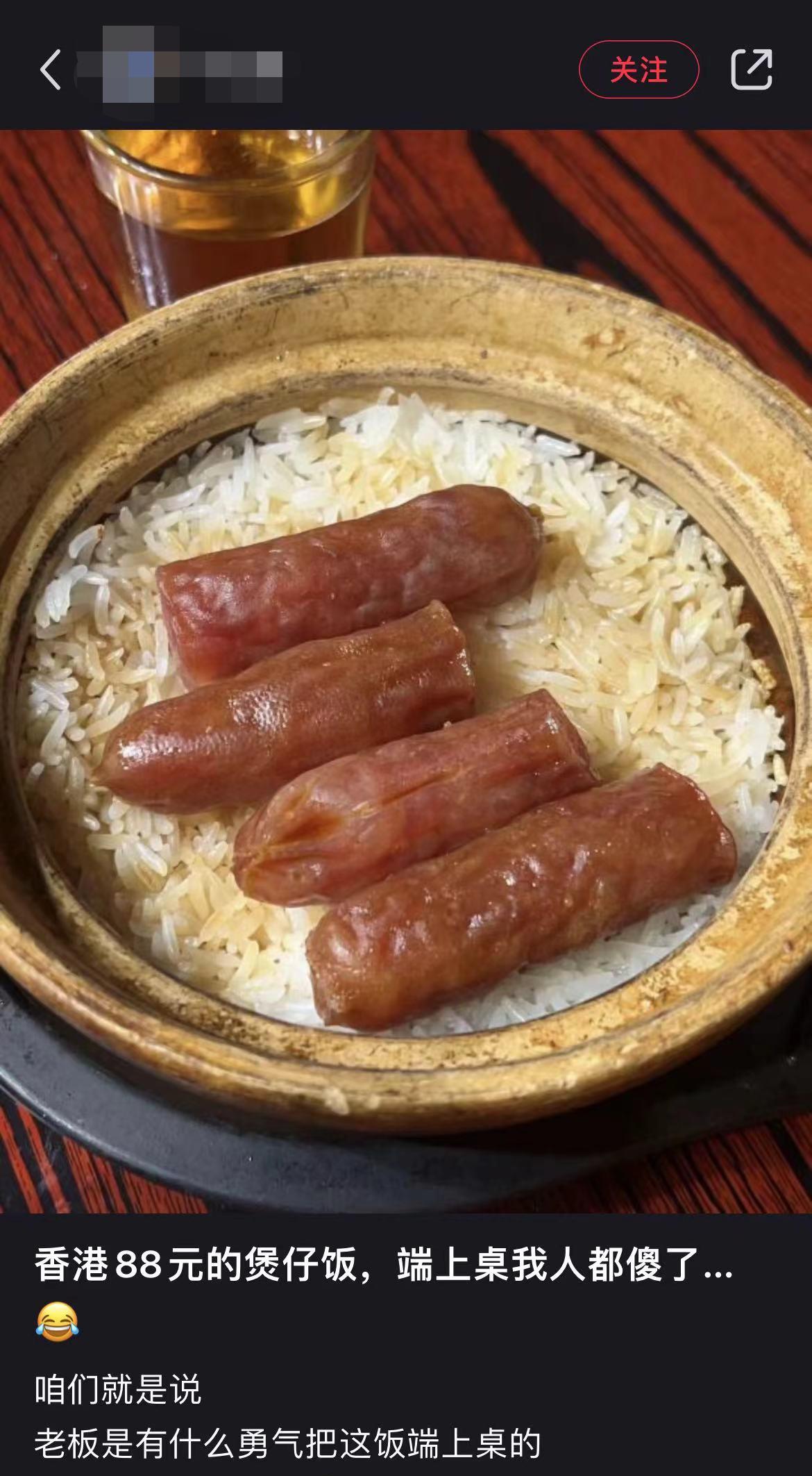该内地男游客于小红书发文,讲述自己在香港找寻美食「中伏」经历,指他叫了一个价值88元的煲仔饭,怎料一看到「成品」便吓傻,「香港88元的煲仔饭,端上桌我人都傻了……咱们就是说,老闆是有什么勇气把这饭端上桌的。」