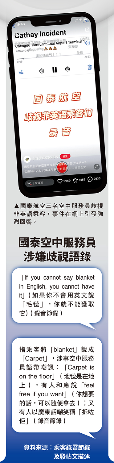 然后,一名空中服务员语带嘲讽跟同事说:“If you cannot say blanket in English, you cannot have it.”(如果你不会用英文说毛毯,便拿不到毛毯),语毕众人一起在笑。