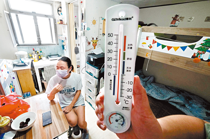 受颱风“玛娃”的外围下沉气流影响,香港天文台昨日连续第二天发出“极端酷热天气”提示,并料未来两三日持续酷热。天台屋及劏房由于地方狭窄、通风欠佳,加上烈日直晒,居民如同住在烤炉中,当中不少人为悭电费,不捨得开冷气。香港文汇报记者昨日到其中一个天台屋实测,室内温度高见摄氏34度至35度,住户说:“不断喝冷饮,甚至吃冰块都无法降温。”唯有白天流连冷气开放的商场,甚至蹭邻居的冷气。