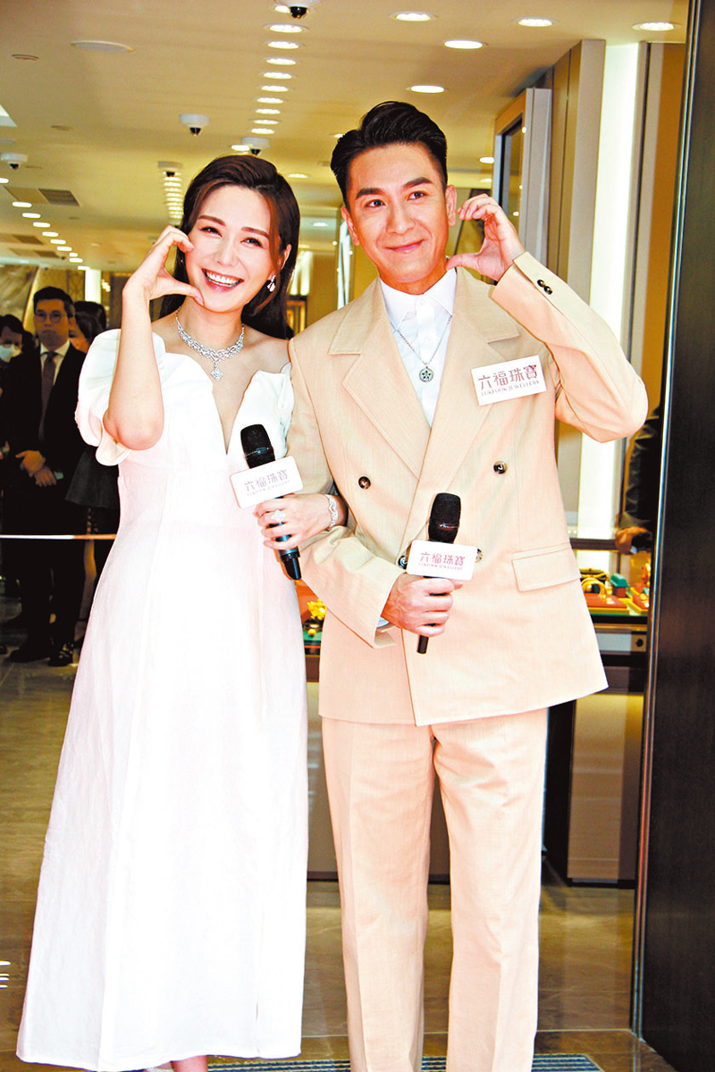 准夫妻马国明与汤洛雯(靓汤)昨日替珠宝店新店担任开幕嘉宾,穿上浅色低胸裙的靓汤,与西装骨骨的马国明如预演婚礼一样,靓汤不时大晒手上鑽戒,又摆出可爱心心甫士,与马国明皆流露幸福笑容,二人更获珠宝店送赠一对龙凤鈪作贺礼。