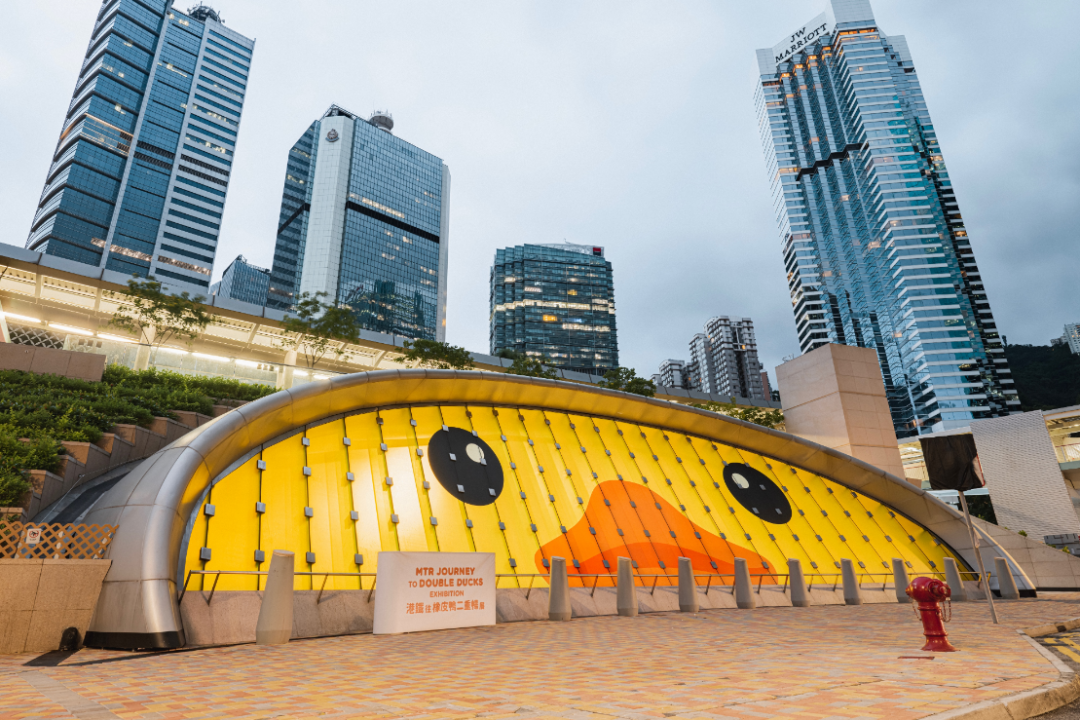 站内多处包括月台等都有橡皮鸭影踪及与展览有关的设计如橡皮鸭脚印、水滴等「打卡」位,金钟站E出口6米高的巨型玻璃天窗首次化身成趣致鸭子脸。