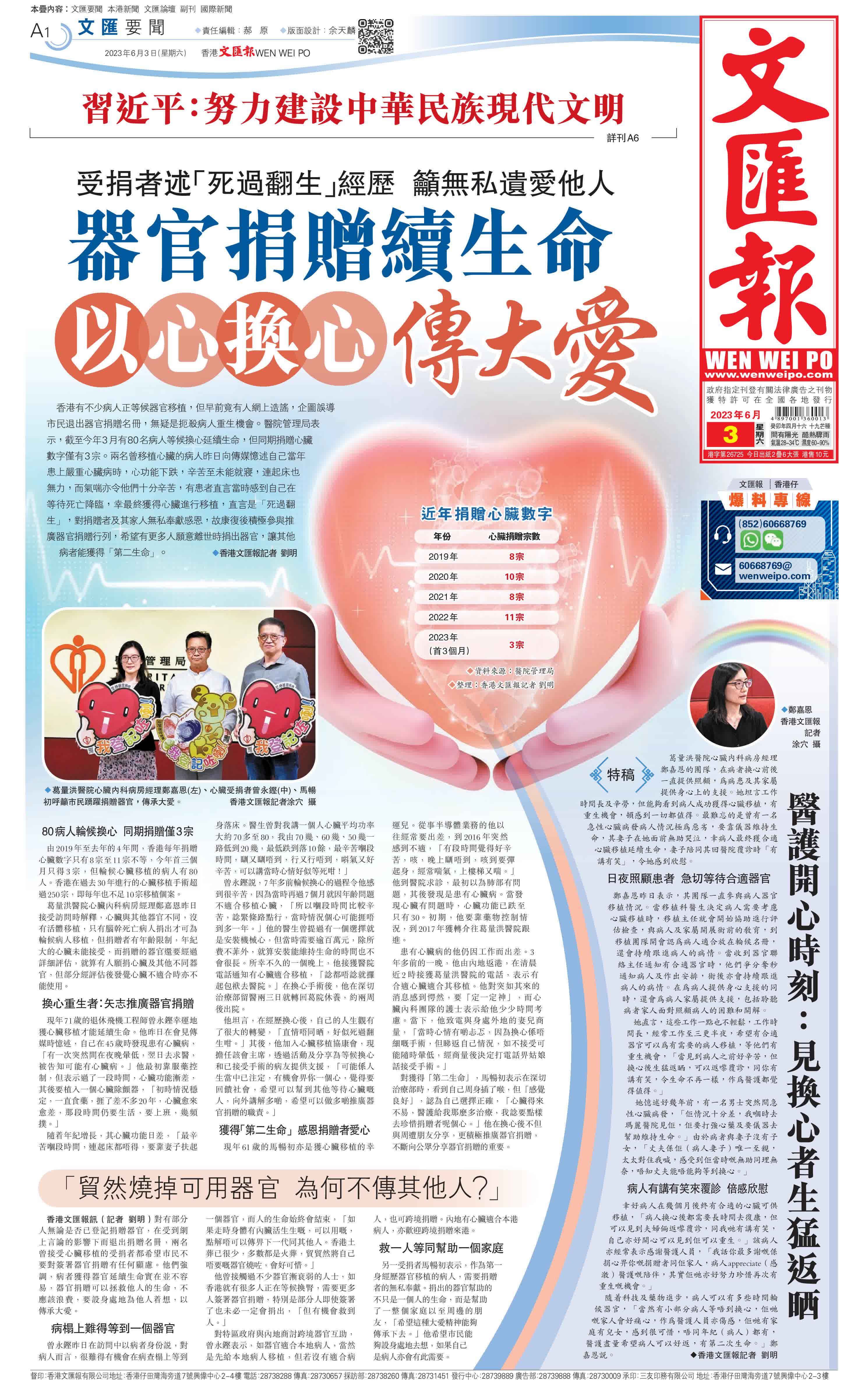香港有不少病人正等候器官移植,但早前竟有人网上造谣,企图误导市民退出器官捐赠名册,无疑是扼杀病人重生机会。医院管理局表示,截至今年3月有80名病人等候换心延续生命,但同期捐赠心脏数字仅有3宗。两名曾移植心脏的病人昨日向传媒忆述自己当年患上严重心脏病时,心功能下跌,辛苦至未能就寝,连起床也无力,而气喘亦令他们十分辛苦,有患者直言当时感到自己在等待死亡降临,幸最终获得心脏进行移植,直言是「死过翻生」,对捐赠者及其家人无私奉献感恩,故康复后积极参与推广器官捐赠行列,希望有更多人愿意离世时捐出器官,让其他病者能获得「第二生命」。