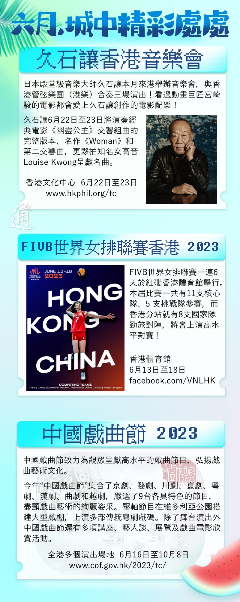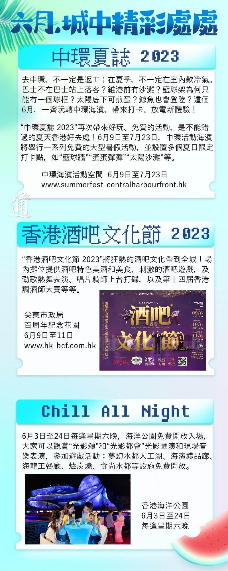 香港踏入夏天,炎热气温令人受不了。天时暑热,也许你只想躲在室内好去处叹冷气?但城中精彩处处,无理由错过令人精神抖擞的夏天。香港新闻网精选了香港六月活动及最新好去处,由体育盛事、文艺演出到特色美食,六月香港好去处指南在此找到!