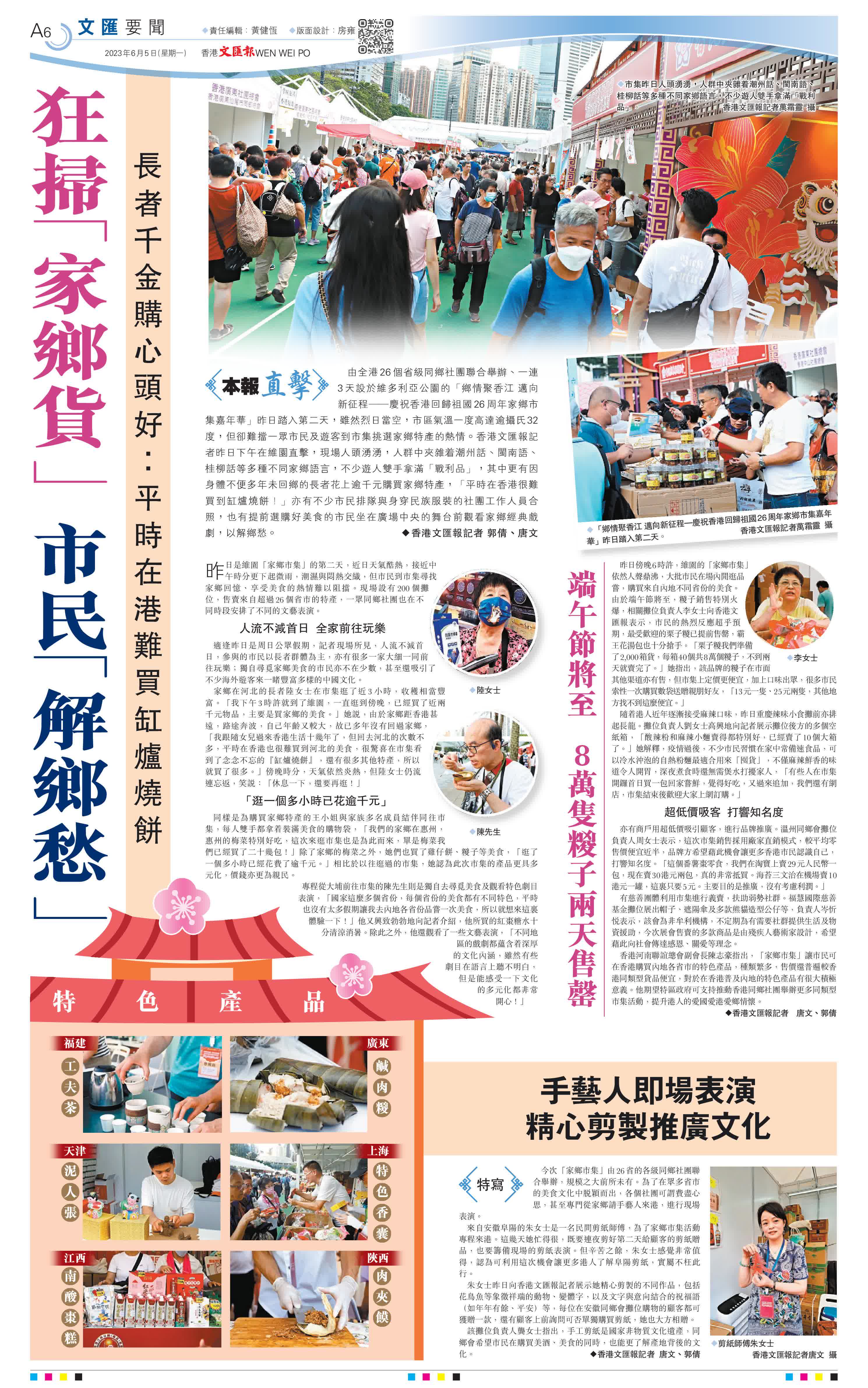 由全港26个省级同乡社团联合举办、一连3天设于维多利亚公园的“乡情聚香江 迈向新征程——庆祝香港回归祖国26周年家乡市集嘉年华”昨日踏入第二天,虽然烈日当空,市区气温一度高达逾摄氏32度,但却难挡一众市民及游客到市集挑选家乡特产的热情。香港文汇报记者昨日下午在维园直击,现场人头涌涌,人群中夹杂着潮州话、闽南语、桂柳话等多种不同家乡语言,不少游人双手拿满“战利品”,其中更有因身体不便多年未回乡的长者花上逾千元购买家乡特产,“平时在香港很难买到缸炉烧饼!”亦有不少市民排队与身穿民族服装的社团工作人员合照,也有提前选购好美食的市民坐在广场中央的舞台前观看家乡经典戏剧,以解乡愁。