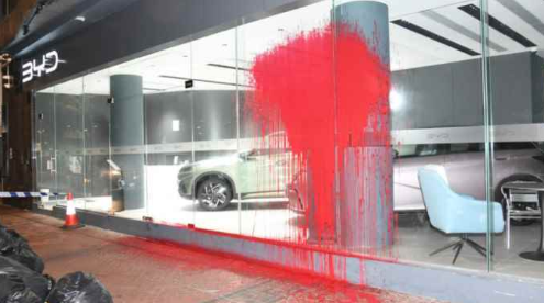 事发在12日凌晨3时30分至4时许,位于在湾仔、尖沙咀、元朗的3间比亚迪汽车展销厅,位于天水围的汽车维修中心遭人刑事毁坏,分别被人淋红油和被车撞闸门。