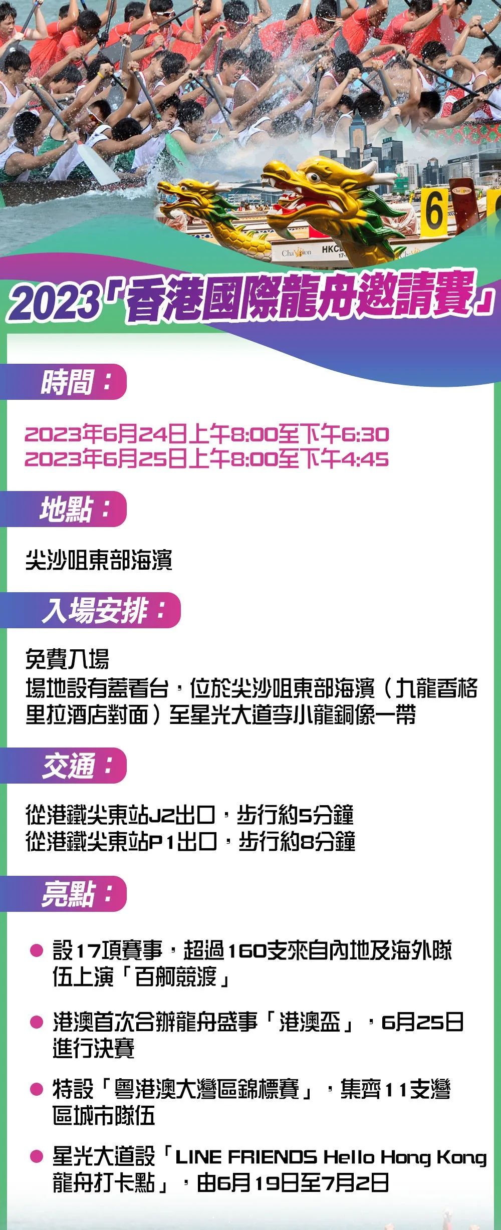 香港旅发局更首设奖金予五大赛事,包括“国际锦标赛”“国际公开金盃赛”“粤港澳大湾区锦标赛”“香港锦标赛”及“港澳盃”,冠军队伍将获1万美元奖金。另外,端午节前后(6月19日至7月2日),LINE FRIENDS BROWN、CONY、SALLY、CHOCO 等一众人物将于星光大道上首次以龙舟运动选手造型粉墨登场,超可爱有没有。游客除了可以和一班LINE FRIENDS在维多利亚港的美景前拍照打卡之外,还可在星光大道的LINE FRIENDS龙舟主题期间限定店购买限定纪念品,节日氛围拉满。