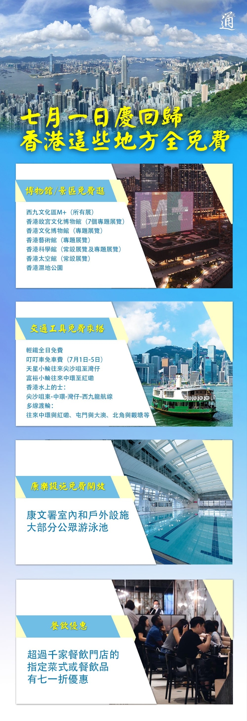 为庆祝香港回归26周年,7月1日全港推出多项优惠活动。当日,香港六大博物馆免费任你逛,港铁将抽奖送出7.1万份免费车程及26张全年免费车票,叮叮车一连五日起免车费,康乐设施免费开放给市民使用,超过千家餐厅指定菜式有七一折优惠。大家还在等什麽?“七一”一齐出动玩乐香港吧!