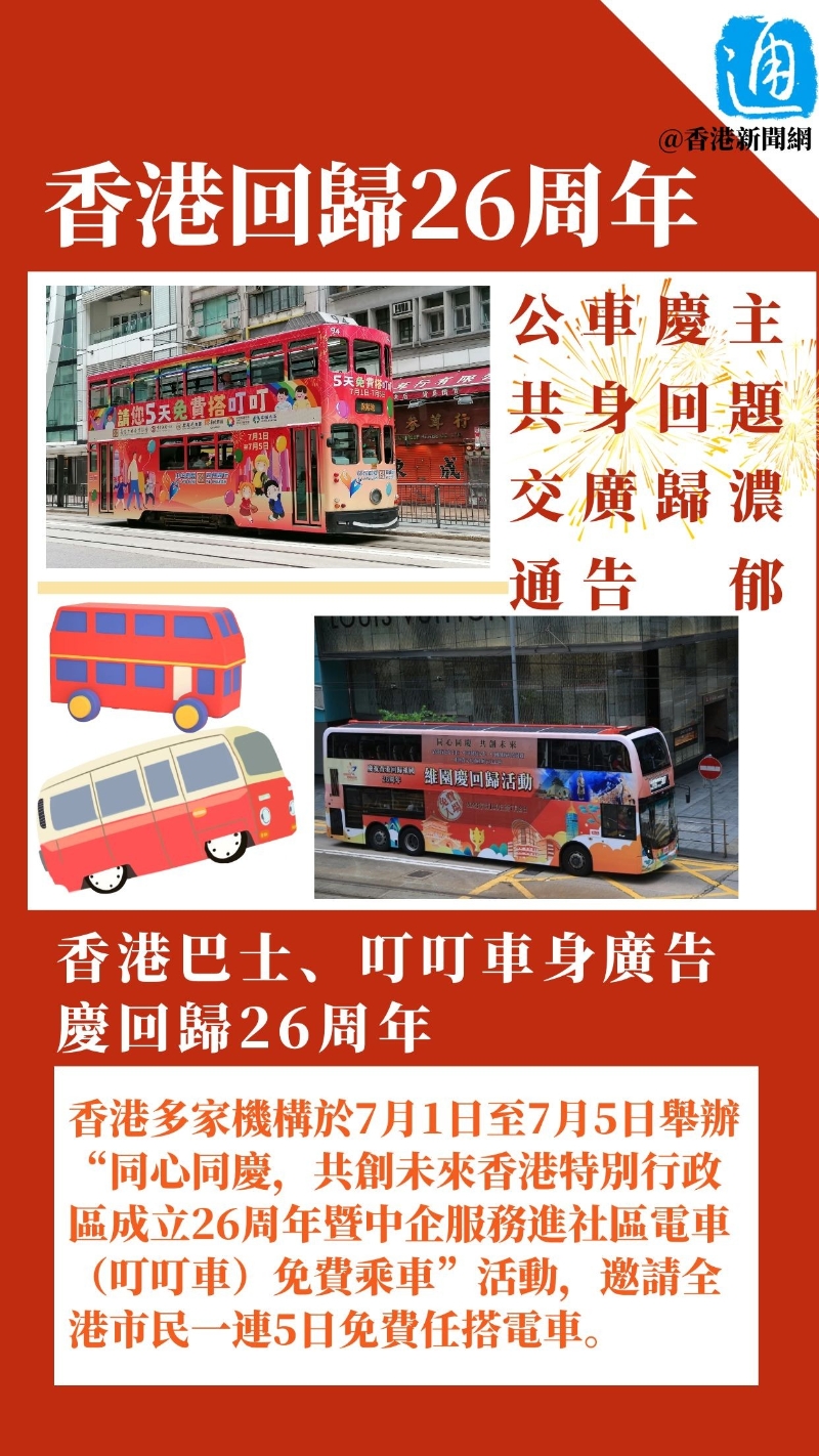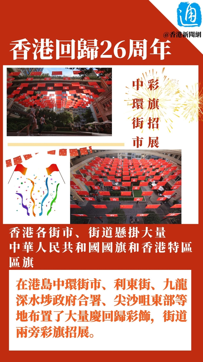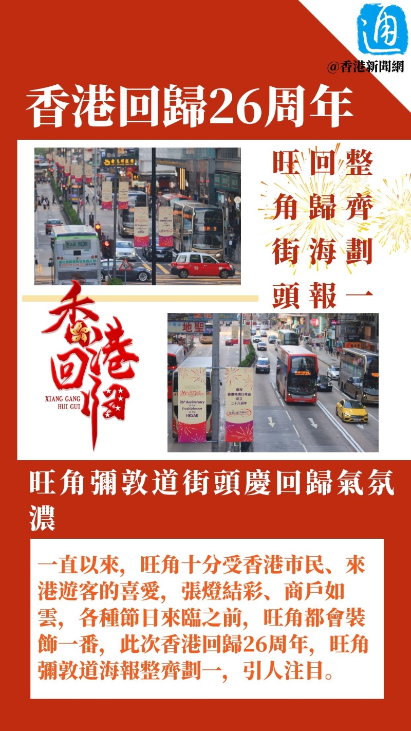 临近香港回归祖国26周年,街头红旗飘飘,从金钟天桥到沙田马场,从巴士到叮叮车,从利东街到弥敦道,庆回归海报及横幅也挂满了,喜庆氛围浓郁。戳图,品味港人的家国情怀↓↓↓