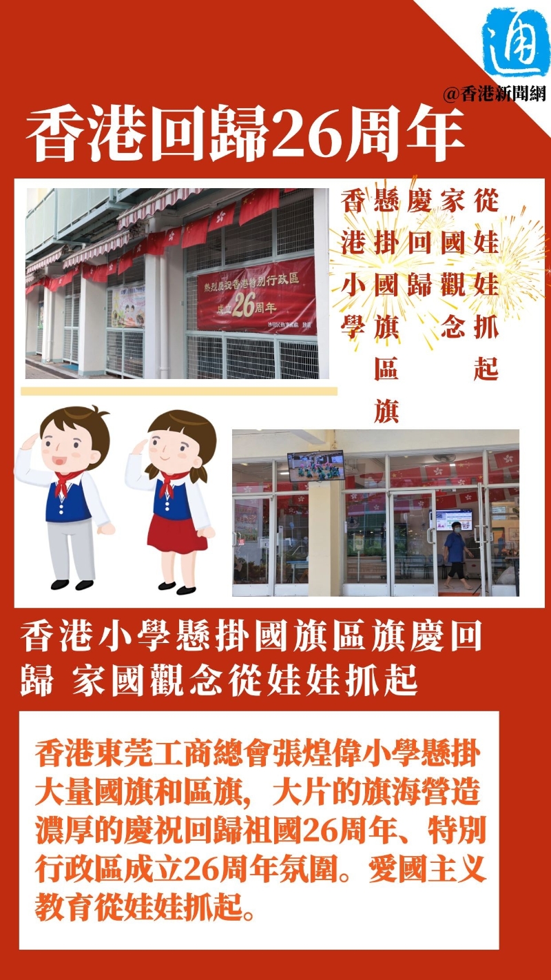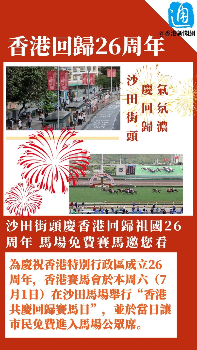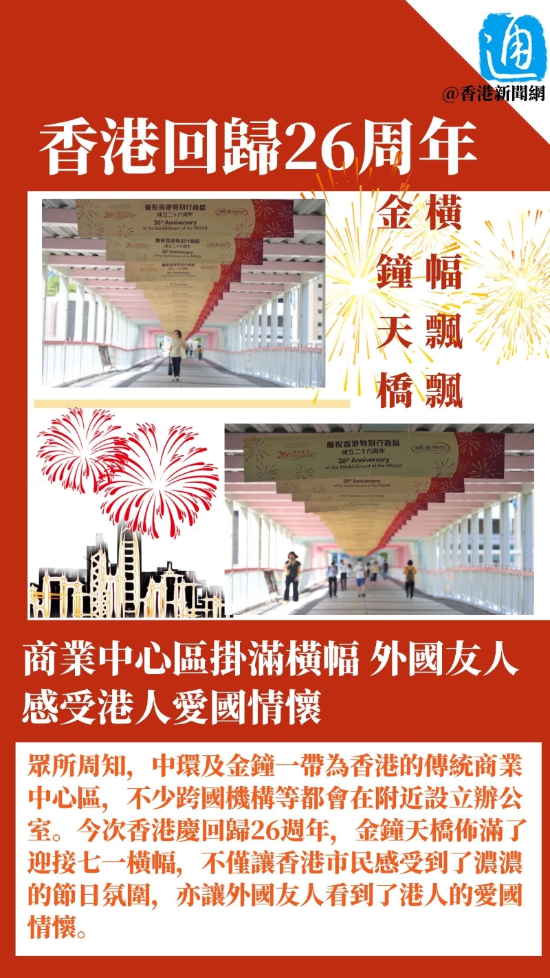 临近香港回归祖国26周年,街头红旗飘飘,从金钟天桥到沙田马场,从巴士到叮叮车,从利东街到弥敦道,庆回归海报及横幅也挂满了,喜庆氛围浓郁。戳图,品味港人的家国情怀↓↓↓