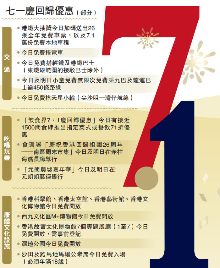 七一全港庆回归,气氛热闹!昨日起一连三日,维园举办庆祝活动,由内地三省为香港市民带来「沉浸式」各地中华传统文化体验活动,市民不仅可以免费体验唐式华服及妆容,在整个园区打卡拍照,亦可深入了解唐三彩、烟台绒绣等非遗文化,亲手制作年画拓印等手工艺品带回家。场内并有多间大湾区城市的创新科技前沿企业作展览,另外有26条吉祥龙、巨型花牌等艺术装置让市民打卡留念。