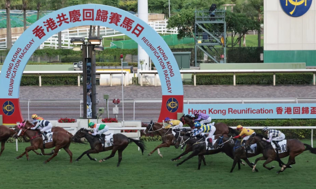 尽管香港白天的热度稍稍下降,但观众席上的热烈丝毫不减。热闹的人声、广播中的赛马评论声、夏日蝉鸣声,共同组成沙田马场7月1日的欢快背景音。