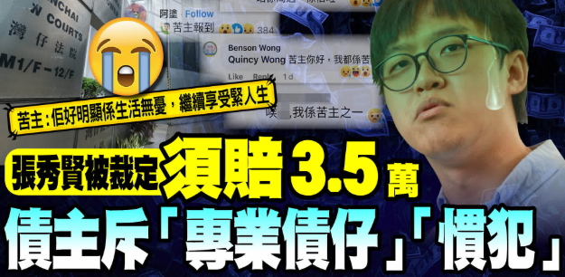 揽炒派前元朗区议员、中文大学学生会前会长张秀贤,被指向多方包括政界及其所谓的“手足”借钱不还,据悉苦主已逾百人。其中一名债主早前入禀小额钱债审裁处追讨欠款,暂委审裁官李英瑜昨日在张秀贤缺席下,裁定张秀贤须向债主赔偿3.5万元,另须支付80元讼费。但李官明言法庭只负责处理判决,提醒申索人仍需妥善保管双方的对话纪录,或须透过额外程序去执行判决。