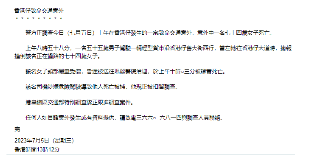 上午八时五十八分,一名五十五岁男子驾驶一辆轻型货车沿香港仔旧大街西行,当左转往香港仔大道时,据报撞倒该名正在过路的七十四岁女子。该名女子头部严重受伤,昏迷被送往玛丽医院治理,于上午10时03分被证实死亡。