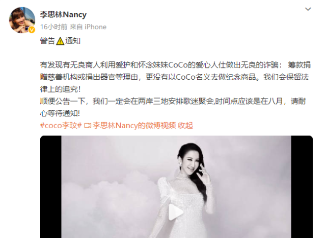 歌手李玟于7月2日因抑鬱症在香港去世。6日,李玟的姐姐李思林在社交媒体发文称,发现有无良商人利用爱护和怀念妹妹CoCo的爱心人士作出无良的诈骗,提醒网友警惕相关行为。