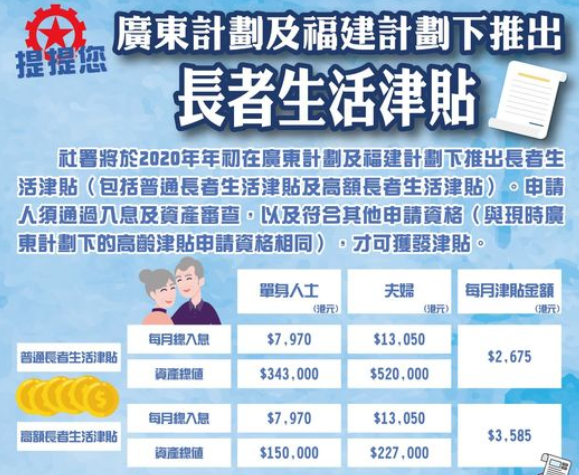 为了让选择移居广东和福建养老的合资格香港居民,仍可以享有香港的高龄津贴或长者生活津贴,社会福利署推出了广东计划和福建计划,让在内地养老的受惠人无须每年返港, 只要每年在广东或福建居住满60天,亦可领取全年津贴。