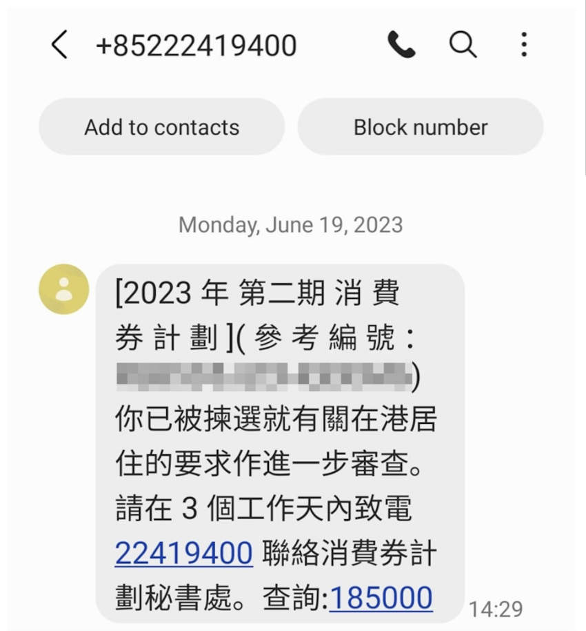 这条短信事关第二期消费券的发放,主要目的就是抽查你是否在港居住,是不是符合领取资格。而你收到这条短信的话,就需要在三天内尽快回复电话。