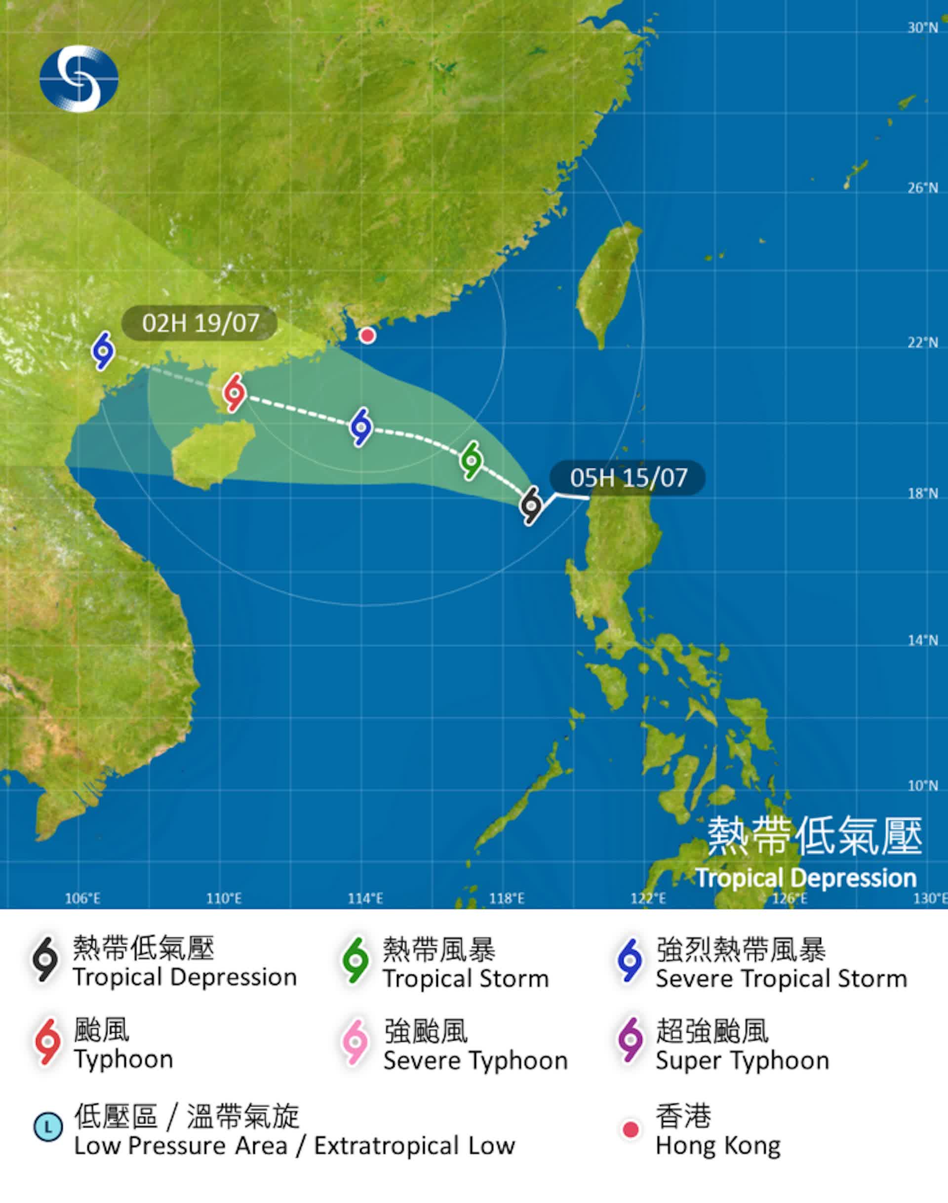 在今早6时,位于吕宋以西海域的热带低气压集结在香港之东南约690公里,即在北纬17.9度,东经118.8度附近,预料初时移动缓慢,稍后向西北方向移动,时速约10公里,大致移向广东西部至海南岛一带,并逐渐增强。